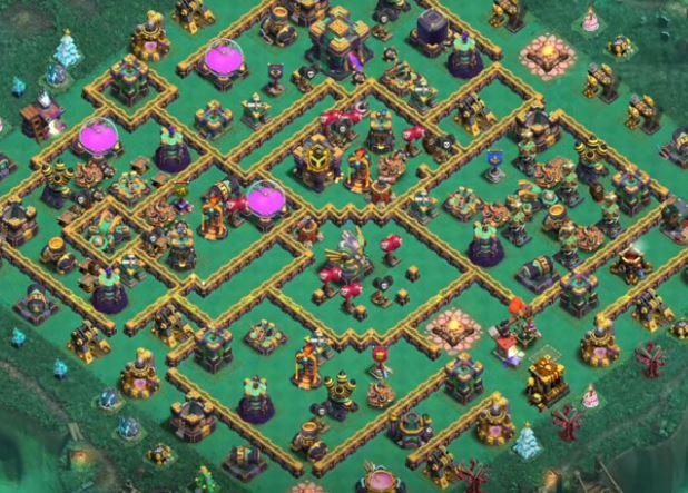 This layout is designed specifically to counter the “Super Yeti Clone Bomb” and “Blimp-Sarch” meta. It features a decentralized Town Hall and a core that looks empty but is packed with Tesla Farms and the Tornado Trap.
